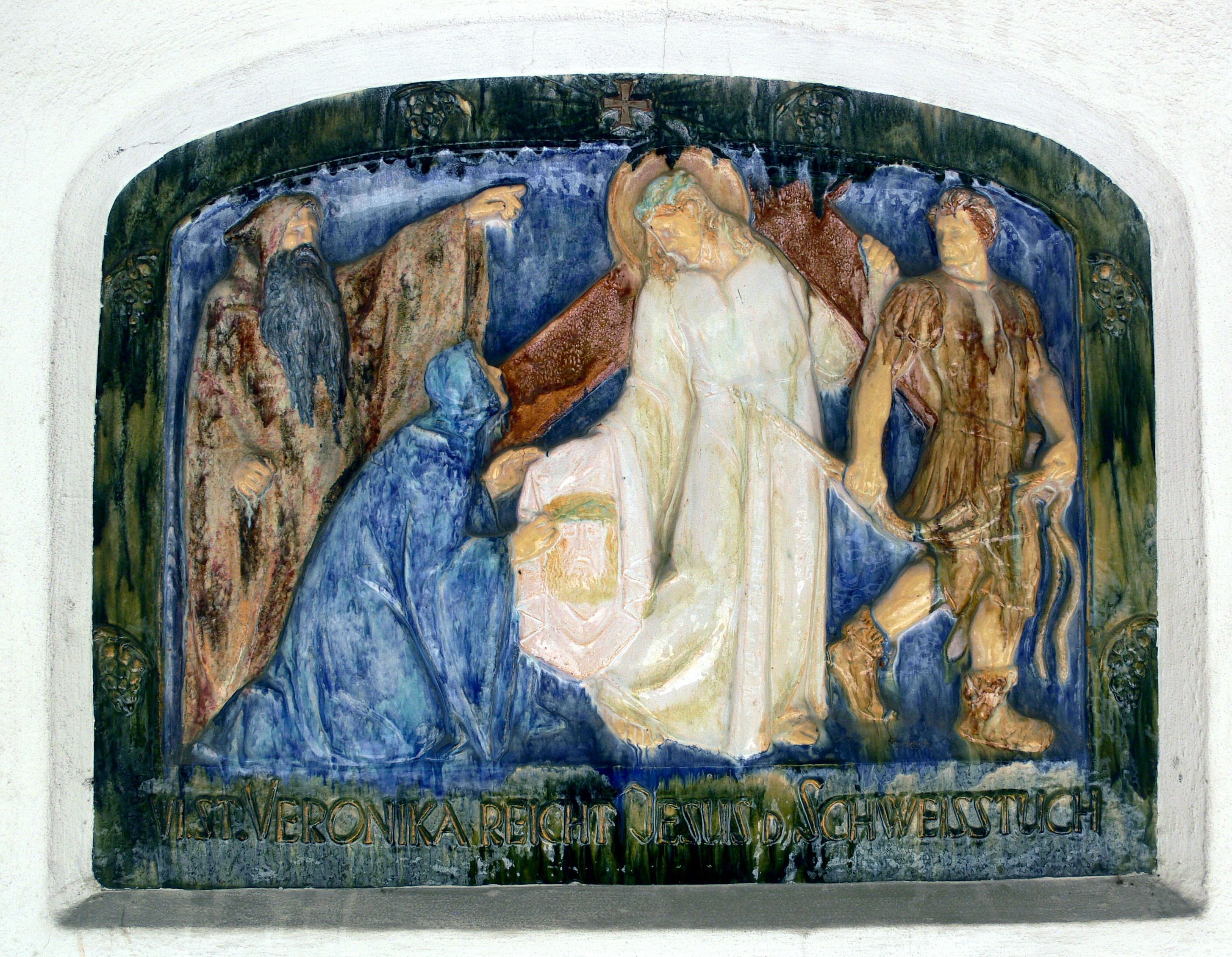 V : Veronika reicht Jesus aus Mitleid den Schleier ihres Hauptes als Schweißtuch dar, damit er sein todbleiches, mißhandeltes Antlitz abtrockne; er aber hat ins Schweißtuch das Bildnis seines Hochheiligen Angesichts eingedrückt. Ein kleiner Dienst, eine große Belohnung! Welchen Dienst und Dank erstattest du deinem Heiland für so große Wohltaten? (wird still gebetet)