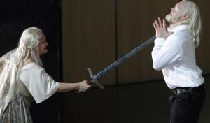 Walküren collect heroes from the battlefields and bring them toValhalla. A pair of twins: Siegmund and Sieglinde are separated by fate and now meet again in Hundings house and fall in love. Sieglindes husband, Hunding, challenges Siegmund therefore to fight with him. Wotan gives Brünnhilde (one of the Valkyries) order that should to support Siegmund. The wife of Wotan, Fricka does not accept Siegmunds adultery and incest and Wotan has to reverse e the order. But Brünnhilde decides to help him Siegmund anyway and Wotan influences the fight by himself. Siegmund is powerless against Wotan and dies, his famous sword shattered. Brünnhilde advises Sieglinde, who is pregnant, to move in the forest where Fanfer the dragon the dragon lives. Brünnhilde awaits Wotan’s anger and Wotan banishes her to a mountain, but protects her wit a ring of fire which only strongest hero” can redeem her (Brünnhilde thought this might be Sieglindes son …).