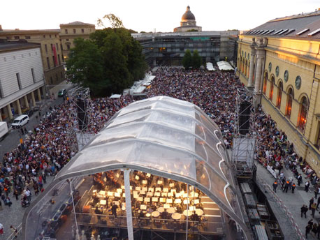 The Munich Opera Festival draws for over 130 years opera fans to Munich, and as one of the oldest international festival continues far beyond the city and national borders. Since fifteen years there is a free eopen air event “Opera for all”. Since the charismatic Conductor Kent Nagano came to Munich Opera, those two events “Opera for all” became even more cult for young folks not used to rattle the jewelry in plush seats. I saw him first time in California (Berkeley) and still appreciate Kent Nagano’s courageous and creative ways to transfer his subtle understanding of classical music to the audience. Already on Saturday – on a beautiful night – he conducted open air with the Bavarian State Orchestra excerpts from Richard of Wagner’s “Ring des Nibelungen”, an arrangement on 16 hours of Wagner’s ring issues put together in one hours without singer. Already raising eyebrows, as a bonus, there he played still another ring – parts of the film music for “Lord of the Rings”.