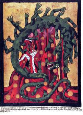 Main action: Jung saw the black serpent, as it wound itself upward around the wood of the cross. It crept into the body of the crucified and emerged again transformed from his mouth. The black snake transformed into become white. It wound itself around the head of the dead one like a diadem, and a light gleamed above his head, and the sun.