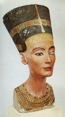 Nefertiti is often referred to in history as “The Most Beautiful Woman in the World.” The Berlin bust (above), seen from two different angles, is indeed, the most famous depiction of Queen Nefertiti. Found in the workshop of the famous and outstanding sculptor Thutmose by a German archeologist , the bust is believed to be only a sculptor’s model. After the counter-revolution almost all traces of her had been destroyed. Thutmose’s technique used a carved piece of limestone, plastered the stone core to be first and then painted. Flesh tones on the face and full lips are enhanced by a bold red give the bust life. Thutmose, may or may not have been her lover, he certainly had access and close contact to her – no man could blame him falling in love. Her graceful elongated neck balances the tall, flat-top crown which adorns her sleek head. The vibrant colors of the her necklace and crown contrast the yellow-brown of her smooth skin. While everything is sculpted to perfection, the one flaw of the piece is a broken left ear. Only a few reigns before her’s had been the reign of Hatshepsut, the most famous (but not the only) female pharaoh, which certainly might have been her role model. How this remarkable sculpture came to Berlin, is quite a(nother) story