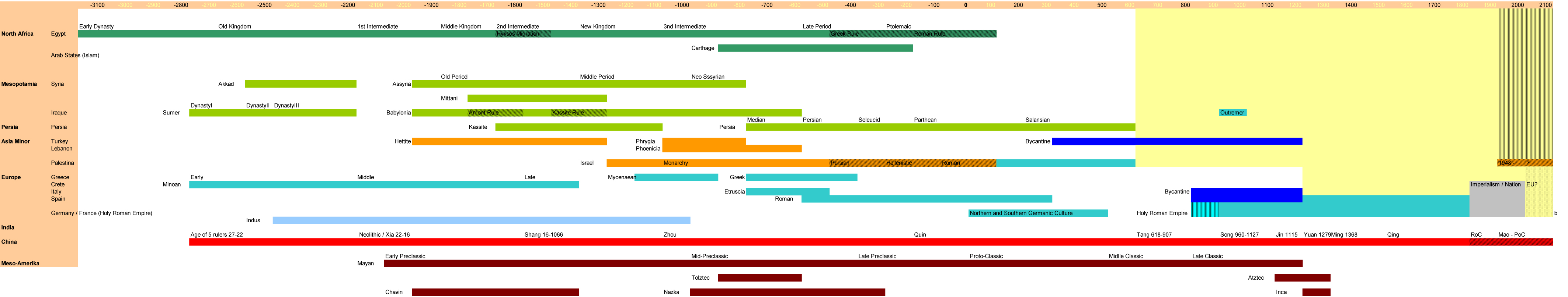 About prehistoric calendar not much is known, and even the old calendar of literate cultures can often only reconstructed incomplete. However, a comparison with various known types of calendars can historically classify calendars. This is a supplementary draft is an overview of the calender development in North Africa, Middle East (including Egypt and Mesopotamia), Persia, Asia Minor, Europe, India, China and Mesa-America from 3000 B.C. to 2000 A.D.