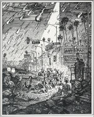 The violent against God (blasphemers), the violent against nature (sodomites), and the violent against art (usurers), all suffer in a desert of flaming sand with fiery flakes raining from the sky. The blasphemers lie on the sand, the usurers sit, and the sodomites wander about in groups