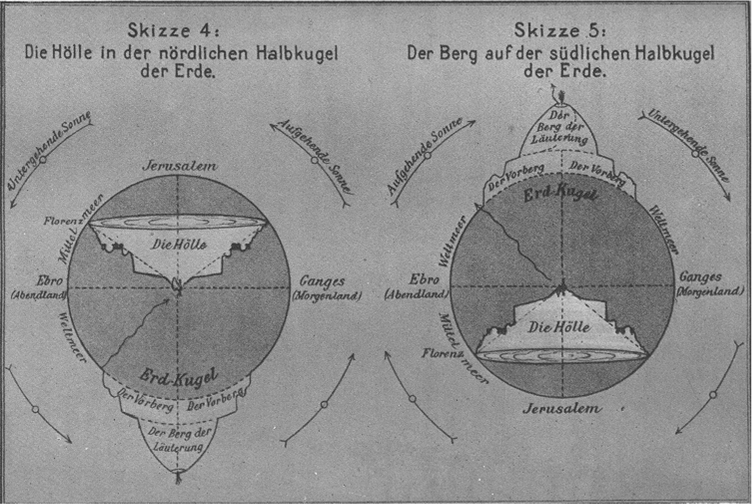Likewise, the Inferno is precisely located in the Ptolemaic system of Dante. Hell corresponds to the conical Purgatory at its negative hollow image. It is located in the interior of the inhabited hemisphere. Lucifer has bored with the insubordinate angels after his fall into the earth to its center. Thus, the funnel-shaped narrowing again be divided into nine circles Hellmouth has emerged. Where did the displaced Earth’s mass go? In this creation model, it was reused as material for the Purgatory and therefore the mountain’s height matches the hell crater’s depth.