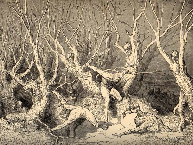 In this ring are the suicides, who are transformed into gnarled thorny bushes and trees, excluded from resurrection. Here are the suicides (the violent against self), who are transformed into gnarled thorny bushes and trees, which are fed on by the Harpies. Unique among the dead, the suicides will not be bodily resurrected after the final judgement, having given their bodies away through suicide. Instead they will maintain their bushy form, with their own corpses hanging from the limbs. The trees are a metaphor for the state of mind in which suicide is committed. The other residents of this ring are the profligates, who destroyed their lives by destroying the means by which life is sustained (i.e. money and property). They are perpetually chased by ferocious dogs through the thorny undergrowth.