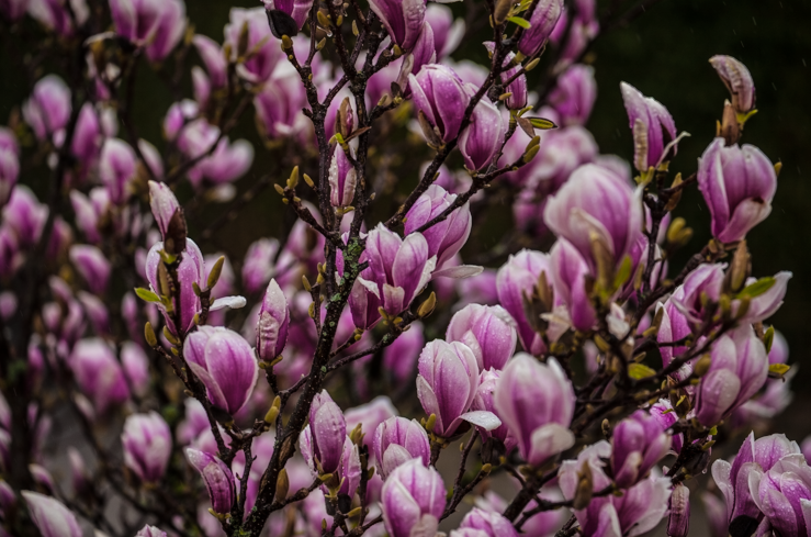 The first day. A miserable gray day. My Magnolia, which opened most of its blossoms after a few nice days too early, is freezing and suffering in the rain and a cold spell.