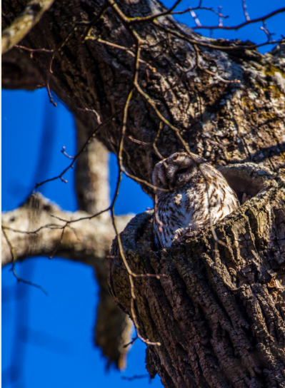 It was a sunny cold winter day, but we went visiting the park anyway. When we walked the dog in the morning, we found the owl was sleeping. The park was almost empty.